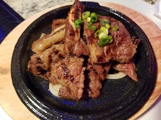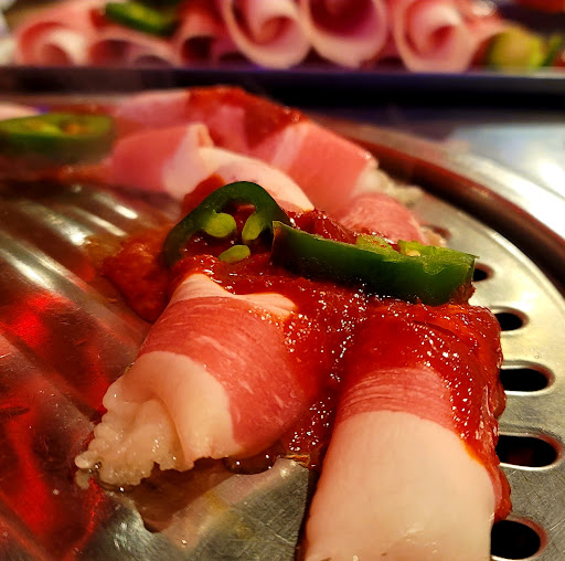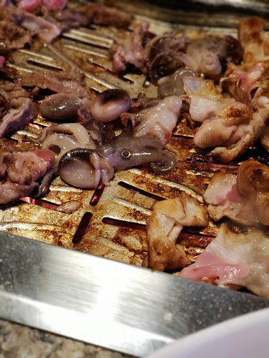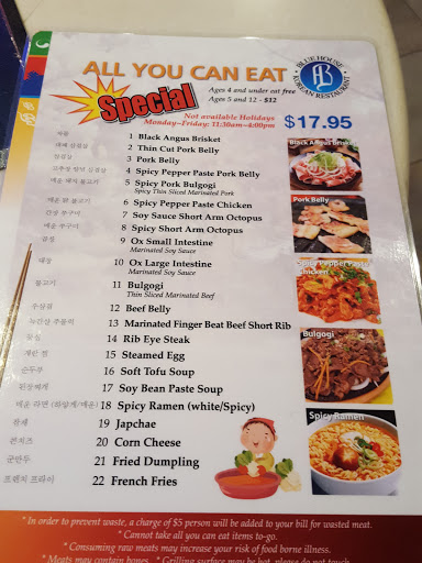 There are two levels of AYCE: Level A ($25), which include a large variety of meats and appetizers, and B ($32), which includes the A level items plus some nice cuts of meat like steak. There is also a weekdays before 4pm special that is $18 and seems to include most of the level A items. Tried a bunch of different things: the cheese corn is a hot skillet with a single layer of canned corn and melted cheese on top, an interesting idea but I didnt find it that great, although I love melted cheese. The spicy ramen wasnt that far off from an instant ramen with a soy broth and some veggies thrown in. The kal bi short ribs are cut really thick and is really meaty. Great quality of meat but it is completely un-marinated, so the flavor is not really there. We tried a lot of the other meats but they are hard to distinguish so its hard to describe specifically here. There was one that was rolls of super-thinly sliced meat that cooked super fast, so fast that it was hard to get it off before it was dried to a crisp. Overall, I found that the marinated meats were tastier than the un-marinated ones (which seems to be the default unless an item says spicy) but thats my preference. I also love gochujang saunce and asked for it. Most other korean places have it in a squirt bottle they leave at your table. Here, it seemed like an unusual request. I had to ask 3 times before they could find some and they only brought a tiny sauce dish of it and another brown sauce, some sort of worchestershire sauce based mix. I wish they could bring a bottle, because I love sauces. The brown sauce was super good though. Overall, I enjoyed the meal at Blue House, but I think the kal bi should be marinated or give us a choice.