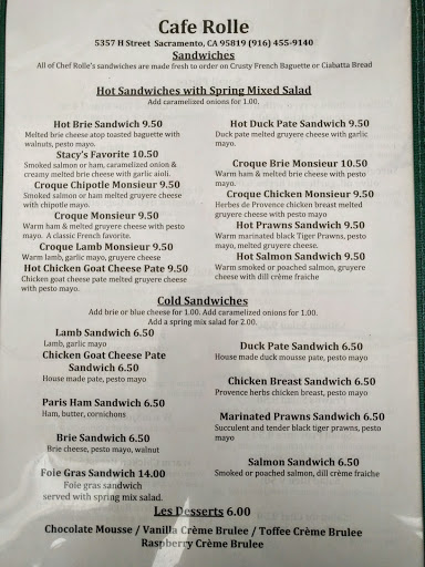 Cafe Rolle has some of the best food in Sacramento. I recommend them to my friends without reservation. Their Croque Monsieur is one of the best sandwiches Ive ever had anywhere. A quaint spot, expect a possible wait especially during the weekends. It is worth it if you do have to wait. Going here is an absolute must.