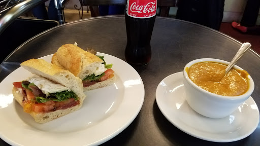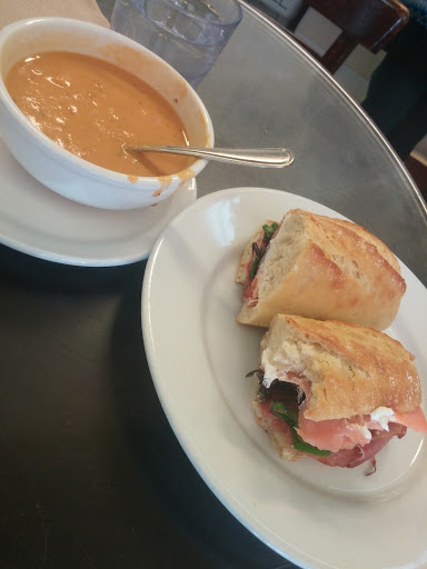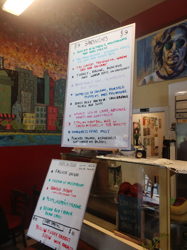 This place has excellent soups and sandwiches. The sandwiches are all made with really high quality ingredients and are just plain delicious. One of the really good ones has melty brie and fig. If you cant make up your mind and want to try multiple sandwiches, you can ask super nicely and the chef will make a half and half sandwich. And dont forget the soups! Perfect on a chilly day and sometimes a nice cold soup on a hot day. The place is tiny though so you might not find a place to sit, which is fine if youre just getting a sandwich.