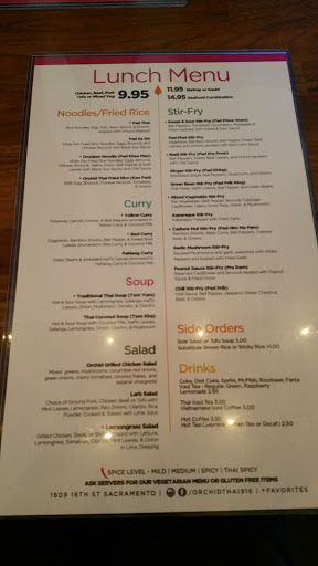 Orchid thai is my go to lunch or drinks spot. They have a super extensive vegetarian menu that makes it hard to decide what to get every time I go there. Some of my favorites are the garlic and mushroom stir fry, the yellow curry, and the basil stir fry. There is never a wait for a table and the service is fast. Ive never been disappointed going here.