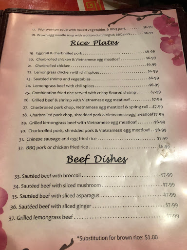 I have been here at least 30 times since my first visit and I still love the place. I always make sure that I stop in if Im close by and sometimes even make excuses to be close by. I love their rice noodle bowls which is served over rice vermicelli noodles with lettuce, bean sprouts, pickled carrots, cucumbers, cilantro, and crushed peanuts. I usually get the #53, which has charbroiled pork and a crispy spring roll. For a bonus of great flavors, I pour some plumb and Sriracha sauce on my food and it becomes a dish thats out of this world. I paid $6.99 and the portions are great. The appetizers are also great and if Im hungry enough i usually get the #2, which is the charbroiled pork salad rolls (6 pieces) served with peanut sauce for only $4.75. They serve Coke products but since they also serve fresh brewed iced tea, which gets a bonus star from me, Ive never had any other drink. But according to their menu they seem to offer a good selection of drinks. Most drinks are basically $2.25 and a bit more for some others. The place is always clean and the employees are friendly. Great prices + great food + great service = great value. I will continue to return.
