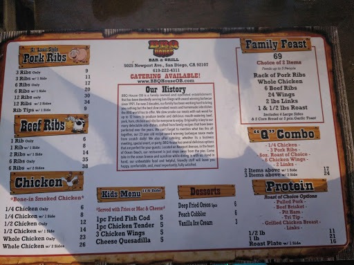 My family loves this place. My dad and mom like barbeque, and this is their favorite -- Dad says the ribs and pulled pork are better than more well-known places (and hes right, for once). It has been in OB for many years, they are very skilled, and the restaurant is remodeled and very nice inside. Oh yeah, there is outside seating right on Newport a block or so from the beach -- the BBQ house has a lot going for it!