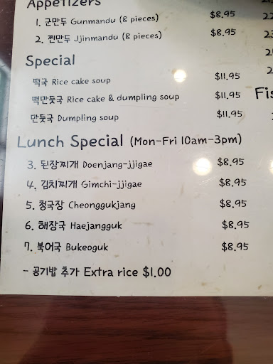 블로그에서 유명하고 평점 높아서 갔는데, 김치찌개는 돼지고기 2점 들어 가있고 한국보다 맛있다는 후기 있는데 그건 쫌 아닌듯함.. 돌솥비빔밥은 우리가 보통 생각하는 돌솥이 아님. 찐만두는 들깨들어가있어서 퍽퍽함. 미국에서 먹어본 한식당 중 최악이었음.