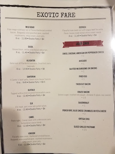 This place is good, but I cannot give it more than 3 stars. The good: the burgers are great and they have a helluva selection with their exotic meats. I think their Texas and Santorini burgers are off the hook. The bad: the only thing crazee about this place are their prices. They dont offer cheese on any of their ridiculously priced burgers. I mean Cmon man, really? They ONLY offer a large plate of fries a la carte at a price tag of $2.50 that I guarantee a majority of the ppl eating these fries do not finish. I payed a hefty $13.90 for a Santorini w/cheese, fries and a diet coke. I cant complain about the food, except I dont think their fries are all that great esp. Given the price. Then they expect you to tip them after they sucker punch you to the gut. I have never even tried their exotic meats like kangaroo or antelope because quite frankly $13-$14 bucks for a burger is a joke. Then u have to add everything else along with it. Great burgers, but there are plenty of burger joints that offer good quality without the headaches of a la carte add ons. I will only go back when I am with someone to share fries and split a 2/3rd lber.. No more solo trips for me.