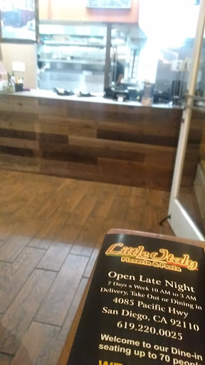 Visiting san Diego from Fresno and wanted to order pizza at our hotel after a long day. So we ordered from another pizza place that took over two hours to deliver so we canceled, called another place and the guy on the phone sounded like he hated his job, didnt ask what kind of wings we wanted or soda so we canceled as well. Then we called Lil Italy and came within reasonable time, had huge delicious wings, pizza was the best Ive had, and everything was great!!! Will be ordering again tonight!!!! Thank you