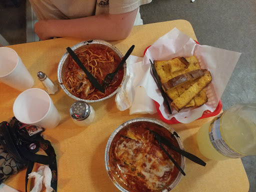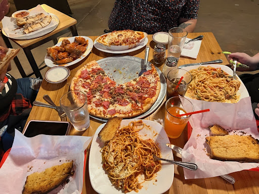The pizzas were thin and delicious! We had a large variety of options from the pizza, spaghetti, lasagna, bread, salad and wings. Limited seating inside but there is an outdoor seating section. The staff was very friendly and brought the food out to us.
