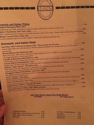 Brunos is one of my favs for wood fired pizza. I love the Campania pizza above the other selections based mostly on the sausage.... but this pizza is actually about the crust. Now listen... you have to know what you are getting into here. This is not Dominos This is wood fired in a 1000 degree oven. The Pizza cooks in about 90 seconds! Expect a little charring on the edges. I love it. We also like the Antipasto salad. A very large portion if its just the two of you, but you can take it home. The wine list is on the shorter side, but offers by the glass or bottle. Prices range in the 30s... the most expensive bottle is a Keenen Cab at $40. They have some craft beer if thats your thing as well. Service has always been good for me. Seems like we always get the same guy and he might be starting to remember us. Thats always a good thing. Parking can be tough on a cold night... you might end up a block away in the neighborhood. Seems safe enough though, and we dont have that many cold nights anyway.