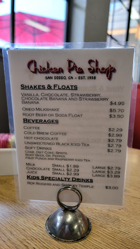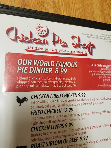 Ahh The inFamous...The One & Only, The San Diego *Chicken Pie Shop* I came here for the first time, 29yrs. Ago..haha sounds like something my mothers stories begin Like, But if it were her story, it WOULD begin as follows: The 1st. Time your father took me here was 52 years ago when I was pregnant with you Mary Anne, my Fifth child, and last I might add. Good ole Mom and her wonderful working, haha lol. We had 4 children to feed, she would say: and this place was our heaven, to take your 2 bothers and 2 sisters, you on the Way, To the chicken Pie shop, because the Pie Dinner back then was only 65¢ and your fathers Steak Dinner was only 85¢, and we had 2days worth of leftovers to boot! The only thing that has changed is the Price, but it is at fair market value, there isnt a place I can THINK of, where you can get A chicken Pie, mashed potatoes and gravy, assorted Vegetables, Cole slaw, a fresh baked warm roll, with real butter,, a hot coffee/soda and a slice of fresh made peach pie. All included for just $8.49 add soup/salad for ,99¢ If you havent been able to get there, I suggest you do, dont say I never told you where to get the most for your $ in San Diego, because I Did! The Chicken Pie Shop, San Diego