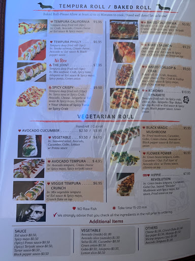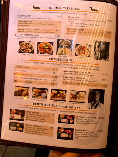 Sushi fans+Bob Marley fans = Sushi Diner. Sushi Diner is a cozy Japanese joint that is zealously decorated with Bob Marley paraphernalia from top to bottom. Dont be alarmed--you wont smell the ganja here! Instead, you will be in awe of a jam-packed menu of special sushi rolls with interesting names like "Smokin Jamaican" along with "Cool Runnings". The names pique your interest and yes--you could read the descriptions of whats on the outside and inside of the rolls but instead you choose to look at the pictures with the sushi caption under it because pictures are worth a thousand words. You forget what your roll is supposed to look like or whats supposed to be in it once you order but when the roll comes, youre quick to chow down because it looks like Picasso on a platter and you had already spent the first 10 minutes dissecting the food in your head before it arrived. It IS that good here with the food and the service because once you get in, you get sushi, and you get out. No frills here with the service unlike other places where you question if the waiter sees youve licked the plate clean because it is a VERY cozy joint--youre within mere feet of the staff here so its no problem to have your dining needs met with attentive service. Only caveat: because it IS that good, you will have a wait for dinner time anywhere from 10 minutes to an hour. Lunch there is no wait. Locals love this sushi joint and with that said--if you havent tried it, trust my review and have yourself a roll! And on a positive note: free private parking lots for diners!