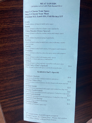 I do like this place. Food is not spicy hot, but spicy flavorful. The prices are 9.99 in the day and 12.99 in the evening. 11:30 am to 3:30pm in the afternoon and 6 pm to 9 pm close in the evening. It is one of the rarest restaurants with a dinner buffet. Extra naan is 2.50 and drinks are extra as well. There is a separate menu with things not offered in the buffet as well. They do take a while to set up sometimes so dont get there too early. Not sure if they are Muslim or Christian, but beef does come up in the buffet. And they have a few limited beef items on the menu. The cooks are Mexican.