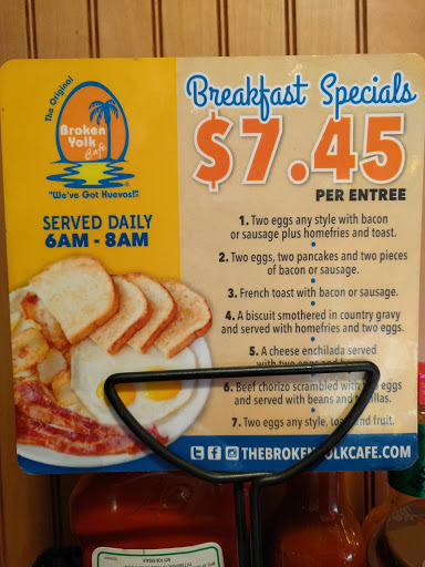 I have been to many Broken Yolk locations and all have had amazing Customer Service. They are open for breakfast and lunch; for both, the portions are huge, and tasty. Many times quantity outweighs quality at breakfast spots, but at Broken Yolk both are on point... Expect to wait 20 minutes or so on busy weekend mornings.