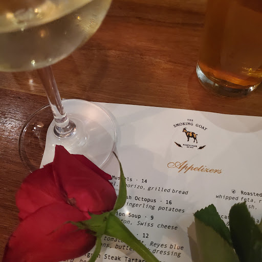 Was looking forward to trying The Smoking Goat from a friends recommendation and it didnt disappoint! My wife and I dined here last evening and it was a hot evening so we asked to be seated at a patio table. The decor was rustic. The menu on their web site seems to not have been posted for 3 or 4 months so we didnt know what to expect on availability or entree prices. I can see the patio being obnoxious for people expecting a quiet romantic meal out as it is right next to a really busy bar patio where intoxicated patrons are being raucous and smoking. Not really the fault of the restaurant but a good thing to know and be aware of -- it didnt bother us and provided some good people watching. We started the meal off with the Duck Fat Truffle Fries. Easily exceeds the truffle fries at Bertrand at Mr. As. Bordering on almost too salty, the herbs and spices and the mustard seed aioli countered some of it. Very rich but also very addicting! The portions were very generous considering the quality. My wife ordered the butternut squash ravioli which came with pancetta, and deep fried brussel sprouts. Very good, you can tell the effort put into the dish and everything was house made. I ordered the Beef Short Ribs and it was nothing short of decadent. The ribs were completely fork tender and fell apart and melted in your mouth. Lots of good flavors going on throughout the meal. Their greens are amazing as well as the sweet mashed yams. We definitely want to come back next time to check out the desserts!