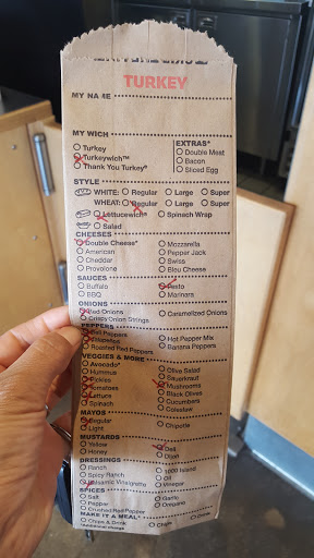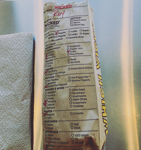 Favorite sandwich shop ever! Im bummed that the one near where I live closed recently, but Ill stop by this one in the Hazard Center (Mission Valley) if Im in the area. Great rewards program, easy ordering and pay if from their app if youd like, also Uber eats delivers if you want. Many dont know what to do when they walk in. Basically, this chain has streamlined the sandwich building restaurant idea. You walk in, and instead of shouting over the noise and dim of a restaurant what you want on which sandwich, you grab a paper bag, creatively pick your name (my kids have fun with that one) and check off what you want with Which Wichs iconic red Sharpies. You present your filled out order form/bag to the cashier, pay, and wait for your name (or the one your chose) to be called. My kids and husband have picked names from their favorite fantasy novels or series, and it always draws a chuckle. The art wall is visually interesting (sorry, forgot to take a picture of it). There are some amazingly talented artists out there and often I find a positive message or two among the art, like quotes from poems, or "Be your own kind of awesome." The food is good. If they mess up, they make it up to you (free remakes, or free next order, or add what was left off on the side with an offer of a free cookie, etc.). So, yes, theyve made mistakes, but theyve always more than made up for them. The sandwiches here have an incredible selection of vegetables to choose from, so great for vegetarian and vegan eaters (unlike some chains, ahem, Jersey Mikes). My son is obsessed with their shakes. They are yummy. We love their crushed ice. Not many restaurants use this type of ice. Also, they offer reusable cups that you can bring in and fill with a shake or drink at a discount.