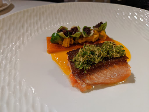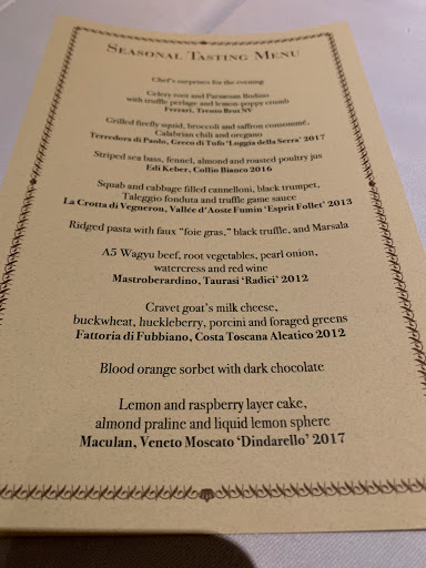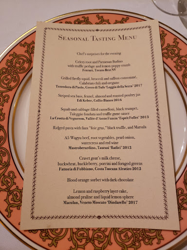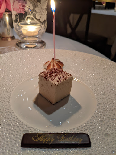 Food was great and service was fantastic. Love all the little extras they give you on top of your meal. Before we got to our first course, the kitchen sent out a few bites and a sip. Then at the end of the meal, not only was there a candy cart, they also gave us a complimentary cake for our anniversary celebration on top of the desserts we ordered. To top it all off, at the very end, they gave us a box of biscotti to take home with us. I also love the fact that they are very flexible with their menu. We both opted for 4-courses and was able to pick whatever we desired from the menu including items off the tasting menu. The only requirement was that we only pick one main course per person. All the dishes we had were cooked perfectly and tasted amazing. The only critique I have is that they did not have a palate cleanser between the last savory course and first sweet course. A granita or something refreshing in the transition would have been nice. None the less it was a superb meal. Fine dining at its best.