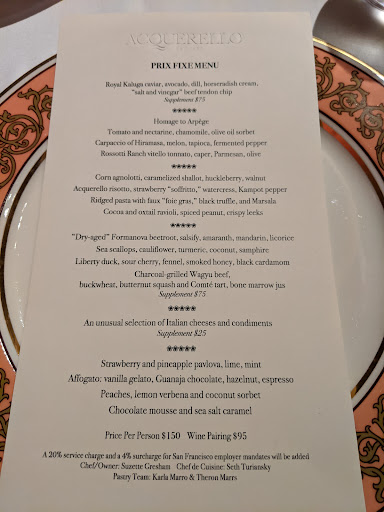 The experience is "best described as ethereal" say diners who "dress up" to get "pampered" at this "romantic" Italian in Polk Gulch, one of the "last SF outposts" for "white-tablecloth fine dining" where chef Suzette Gresham offers "marvelous", "inventive" tasting menus that are "expertly paired" with wines from an "amazing" list by an "oh-so-attentive" staff; the setting in a former church is "quiet enough to talk", and amenities such as "stools for ladies purses" seal the deal for a "special occasion" that celebrants "remember for months." Learn more about Acquerello. What to order Tasting menus only (pictured) Cheese cart Insider tip: Acquerellos Italian-only wine list is 100 pages thick, featuring wines from every single region of Italy.