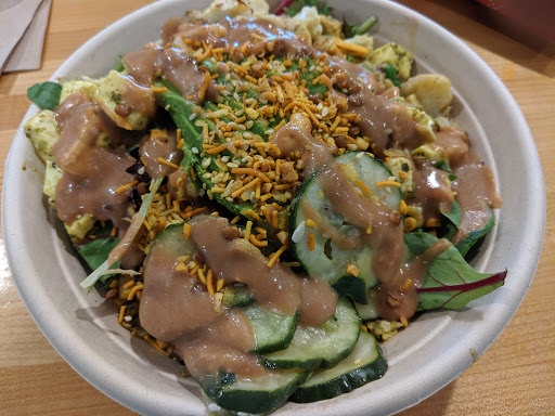Great spot for lunch. There are 3 different stations offering indian, vietnamese, and japanese rice bowls, salads, etc. The beef salad at the vietnamese counter is especially tasty with eggplant chips, pineapple, and pickled veggies. The spicy tuna salad at the japanese counter is also delish. They dont mind if you substitute dressings so try it with the ginger dressing. The price is okay for the quality and the area. Grab a punch card which is good for any lunches over $10.