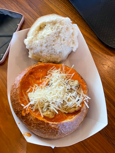 Theres seating inside and out in the mall area. The menu is simple. Usually I get a salad or clam chowder. Other times in picking up a loaf of sour dough bread.