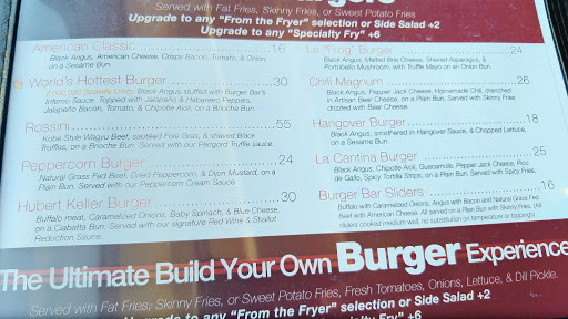 Burger Bar is a burger restaurant from a gourmet chef (Hubert Keller) at gourmet prices (~$20 a burger) that serves painfully-mediocre food. On the list of well-known, superstar chefs, Hubert Keller has always been the one that I always scratch my head about -- I thought Fleur de Lys was all presentation with mediocre taste. But a burger joint shouldnt be too difficult for a renowned, experienced chef, right? Maybe for Keller it is. The Le "Frog" Burger, with brie cheese, shaved asparagus, sprouts, and garlic aioli, was just okay. The flavors werent very strong, so it didnt have anything special going for it. The thick meat patty wasnt cooked enough for a "medium," so it was just an unseasoned, mushy burger. Ive also had the Hubert Keller burger, which I had at a "medium," but was strangely too well-done, so it was just an unseasoned, dry burger. The one redeeming factor? Burger Bar has some pretty killer fries. Both the regular and sweet potato fries were delicious -- perfectly crispy. The view of Union Square is also a good reason to come up for a drink or two. As for the main star of the show, Burger Bars burgers just arent good enough for the outlandish prices. In fact, if you just walk a few blocks down, youll hit Pearls Burgers, which has burgers that are phenomenally better at 1/3 of the price. There are so many delicious burgers in SF that Burger Bar should only be considered if: (1) youre shopping at Macys and your lazy ass is too hungry and tired to leave the Macys building, or (2) you are a tourist who doesnt know any better.