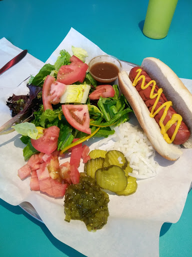 Straight up burgers, without much complication. They offer lettuce wraps if you need to be gluten-free. Neon and chrome ambience evokes a 50s diner; soundtrack was 70s.