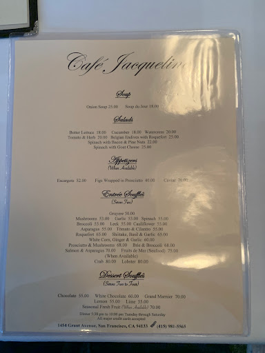 An amazing experience. Definitely on the pricey side of dining, but good food requires good ingredients and when you add the atmosphere and seriously great service it costs more. If your visiting San Francisco, plan at least one evening at Cafe Jasqueline. Reservations are not required but highly recommended. Jacqueline is the creator of some amazing souffles i can only speak to the Prosciutto Mushroom and the lemon souffle, but both were amazing! The menu is designed to feed 2. Souffle takes a bit to prepare so dont expect fast food. Expect a great dining experience from Europe - where they would never consider eating behind the wheel of a car. Dining is an experience, not just cramming in calories. The food here s 5 Star and the waiters were 5 Star as well. Dont be afraid to ask advice. They were very set on us having a wonderful evening. A truly wonderful dining experience.