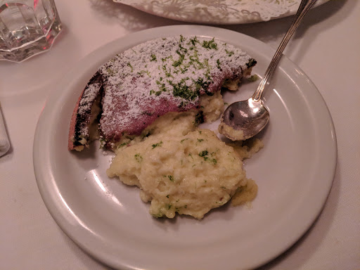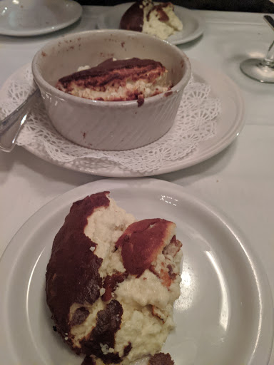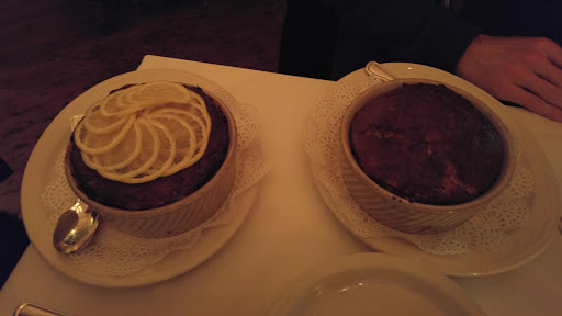 Make sure to take your statins before you come: lipitor or zocor will work just fine. Youll be fighting against the tasty but heavy triumvirate of cream, butter, and eggs. You start off with a salad or soup appetizers. The three pepper soup I had was delicious. No matter your predilection get an appetizer; souffles take a long time and youll be starving if you skip the apps. Then you share a souffle and they have a bevy to choose from. The lobster souffle we had, had a carmelized cheesy crust, rich egginess, and huge chunks of lobster. We were scraping the ramekin trying to get the last bits. Lastly you split a dessert souffle and we went with the classic of chocolate. When it comes you must be careful not to inhale the powdered sugar which coats the top. It could cause a choking frenzy which would be an unwelcome scene in the small space. With little lighting and marginal decor, our powdered sugar choking fit had the whole restaurant looking at us. We sure filled up on the chocolate souffle though, and there was NOTHING left in the ramekin. It really is an amazingly delicious and large souffle. Service was lacking, but you really only come here just for the souffles. The wine list is very reasonably priced and complements the menu well with mostly French selections.