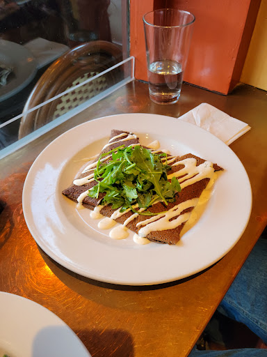 Lazing your day away in cafes is one of the best things about Europe that is really hard to replicate in the US. This spot does it perfectly, and transports you to an old world feeling, with hip, fresh, delicious food. Its quaint, small, intimate. The waiters are decidedly French, and whisk you through their menu. Its perfect. My sister and I went for a late lunch last Saturday, and everything hit the spot. We had mimosas, which were a nice mix of champagne and OJ, and definitely not watered down. For lunch I had the savoyard crepe, and it was delicious. The crepe batter was darker - maybe buckwheat or something a little heartier than flour. It was crispy on the outside, but still warm and fluffy after slicing into it. The flavors were on point, and when paired with their special mustard, each bite was heaven. My sis went for the burger, which was perfectly cooked on a "giant crouton" bun, which was way better than any american bread can do. You get your choice of cheese or add on, and everything is wonderful. New fave brunch spot in the city! Cant wait to come back!
