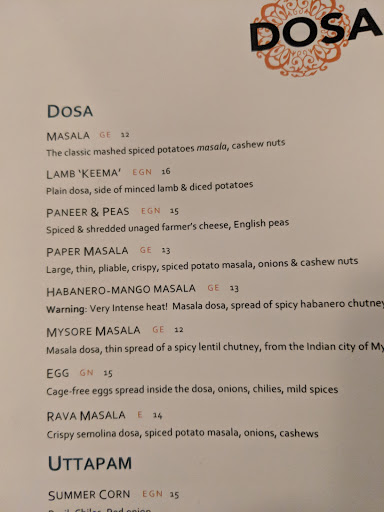 Super restaurant indien, cuisine du sud, dont la spécialité sont les fameux "Dosa" qui sont des genres de crêpes géantes accompagnées de différents mix. Je conseille le Lamb Dosa (agneau) qui est délicieux. Attention le resto est petit et très populaire, donc toujours réserver. Aussi, bien préciser le niveau de spicy/relevé que vous souhaitez car ça risque dêtre très piquant...