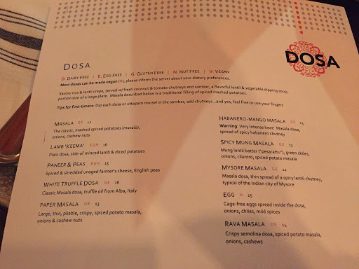 Id been waiting to try Dosa for quite some time and wasnt wowed by my experience--but definitely wasnt disappointed either. Southern Indian cuisine is different than your average Indian restaurant, making the menu a bit hard to navigate. Our waitress (while very nice) was not very helpful in this regard. She kept getting confused by what we were looking for, and her descriptions were not too helpful. We ended up trying the chutney sampler and the masala dosa. The chutney sampler came with generous portions of 4 different chutneys--all were OK. The tarragon sauce tasted a little like A1 steak sauce? The masala dosa (crispy, crepe-like bread filled with curry "mashed" potatoes) was very good! The mix of textures and flavors was really unique. The food was good, but a bit expensive for what you actually get (in terms of quality, not quantity).