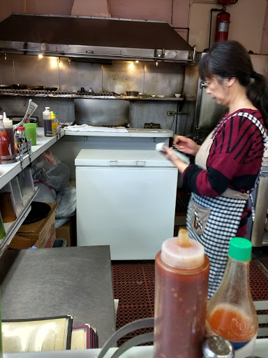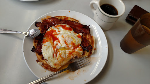 Nothing fancy, just simple greasy spoon fare like omelets and pancakes, along with GREAT hash browns. No fuss no conversation waitresses keep your coffee full and the service tight. Small counter seating area, I think there is one or two tables by the window. Cash only!