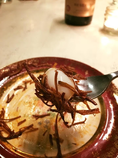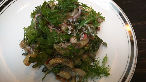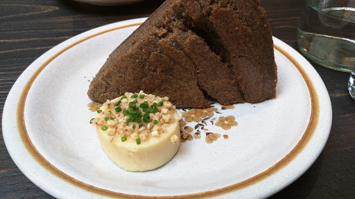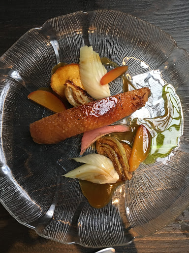 I had heard great things about this place, so I was excited to find myself nearby on a Friday night and looking for a place to grab some dinner before a party. My two friends and I stopped in around 7pm and we were seated immediately. Our server gave us a run down of the menu and the drinks and we ordered a few things to share: Toasted buckwheat cornbread: 3-stars. Served with salted honey-miso butter and chives. The bread was warm, toasted, and instantly fell apart as we ate it. The buckwheat flavor was a bit too much for me, it just tasted like buckwheat bread and not cornbread. The butter was great, though, and the chives provided a bit of sharpness. Chilled avocado and mint soup: 4-stars. Served as a bowl with melon, cucumber, and pistachio, then the soup was poured around and on top. Very minty, very refreshing, and surprisingly tart, thanks to creamy buttermilk. This dish initially came off as light but was deepened by the earthiness of the pistachios. I wish there had been a few more! Poached halibut: 3-stars. Served on top of corn, okra, and parsley with a pour over of tomato horseradish broth. The broth was thicker than it looked, though it wasnt heavy, and it had a very distinctive flavor. Poaching the halibut gave it interesting texture and the burnt garlic on top was a nice touch, but the dish was overwhelmed by parsley and most of the ingredients were bland and boring. Overall, I found the dish unremarkable. Green garlic spaetzle: 4-stars. Served with cabbage, hen of the woods mushrooms, whole grain mustard, and chunks of apple and kohlrabi. The spaetzle was unexpected, both in its length and color. At first glance, I almost thought it was pieces of asparagus instead of spaetzle. The dish had lots of mustard seed and quite a bit of dill, though I enjoyed both, as well as the other earthy flavors. The brussel sprout leaves, in particular, were awesome, and I wish there had been more mushrooms. Aged duck: 5-stars. Served with roasted peach and wild fennel. This dish was the star of the night. The duck was super fatty and perfectly rare. The fennel was caramelized to perfection adding some subtle spice and sweetness. The peaches were ripe and sweet. Everything came together really well. I just wanted more! Overall, I enjoyed my meal, but I likely wont be running back here anytime soon. For starters, its out of my way, but also it was pretty pricy for what it was. The bill came to about $150 (food plus three cocktails), which was more than I felt the meal was worth. The atmosphere also felt a bit pretentious, which was a bummer. That said, Im glad I tried it.