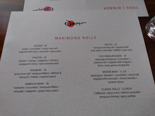 One Word: EXPENSIVE Dont get me wrong, Ozumo has good food. The fish is fresh and the quality is good, but youre gonna pay for it. I like sushi. I eat an OK amount of it and Ive tried a decent amount of sushi restaurants. The quality of fish found at Ozumo can be found at much less expensive sushi restaurants. What youre paying for here is atmosphere, service and "innovation." Atmosphere - Ozumo is a trendy place. Bring a date here if you want to splurge a little. The bar is always full. The interior dining area is not. Service - Our server was very attentive - to the point of overly so. He was very good about filling up our water glasses, but he would also reshuffle our plates and practically reorganize our table while we were still eating. Attentive - yes...borderline annoying...yes Food - the quality was good. I wouldnt say it was the best sushi Ive ever had, nor was it the most creative, but it was above average. The saki was good. But for $150 bottle, it had better be DAMN good. Would I go back to Ozumo? Probably not