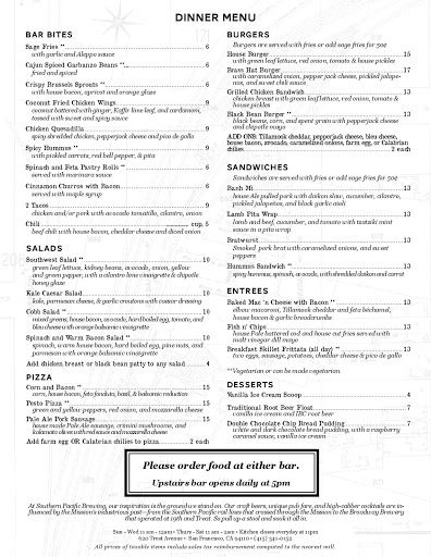 Meh, Me and my girlfriend were here on a Monday at 5:30. The beer was average and there was only 5 in-house selections. The brussel sprouts appetizer was good and the fish and chips were, again, average. The reason for the two stars was the service. I didnt see one of the 7 staff members smile and the waitress looked at us like were nuts for asking for ketchup. The vibe was just totally crap. I wouldnt come here again unless a friend wanted to. So many better brewery restaurants in SF. Dont open a brewery restaurant unless youre passionate about beer, food and service. Update: so Ive been here twice since I wrote my reviews above. Both times have reinforced my view of this place. The staff is sooooo lame. Im at the point where I just wont come back even if friends want to come here. This place is basic as hell.