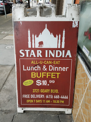 I lived near Star India since 1996 but didnt discover it until 2004... And Ive been going several times a week ever since. We even make special trips from our new home in the East Bay! Ive eaten lots of Indian/Pakistani food over the last few years, and I love lots of places (try House of Curries at Ashby and College in Berkeley), but nothing tops Star India. The all-day and very affordable/absolutely delicious buffet has me hooked. I could really eat here every night! Nicest staff ever, too.