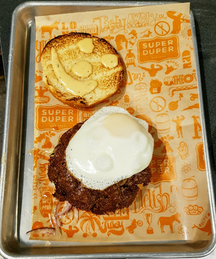 Went here with my girlfriend. She had a junior (read: single) burger with, bacon, cheese, and avocado. "Everything on it," which is all the freebies, but grilled onions rather than just red onions. I had two super (read: double) burgers, the same way. We split a garlic and cheese fries. A lot of people really like Super Duper. I mean REALLY like Super Duper. It is what it purports to be. A semi-upscale fast food burger place. They have vegetarian options and I saw a chicken sandwich, but you dont go to a steakhouse and order the salad. Id probably say their burgers are little better than In n Out. Definitely juicier. Certainly more customizable, although I doubt you can get a 3 patty burger. Also, they have really good pickles.