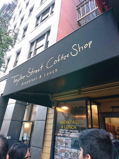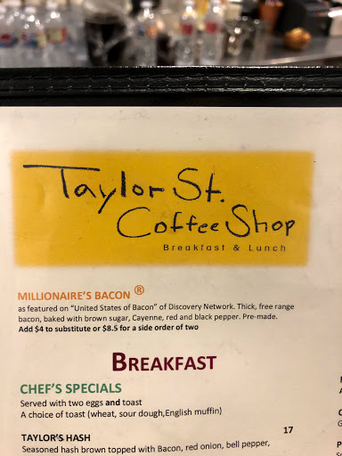 Taylor Street Coffee Shop er et trivelig lite sted for frokost og lunsj. Jeg har hatt frokost der noen ganger, og det har vært strålende bra. Maten er typisk amerikansk, men i god kvalitet. Super og avslappet service. Spesielt: Millionaires bacon. Surdeigsbrød. Omelett.
