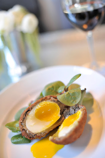 YUM. Came here on a Saturday night with two friends for dinner and drinks. I wasnt sure what to expect, but I came away impressed. Lamb scrumpets: 5-stars. Theres a reason these have been on the 7x7 Big Eats list three years running. Theyre incredible. Lightly fried morsels of lamb served on the bone. Perfectly tender and rare on the inside, not greasy or too heavy on the batter on the outside. The mint chutney served on the side is the perfect amount of sweetness to pair with the lamb without overwhelming it with sugar or mint. Corned beef scotch egg: 4-stars. The egg was perfectly done, it broke to absolute perfection. The corned beef was very rare but tasted really good, like a reuben inside a scotch egg. This dish was great, but the price tag brings down its star rating - it just wasnt worth $15. Sauteed wild mushrooms: 4-stars. Absolutely not what I expected, but really delicious. I expected... well, sauteed mushrooms. Instead we got a puff pastry type thing filled with creamy mushroom tastiness, with spinach and leeks. Though heavy, the dish was hearty and filling, and the earthiness of the mushrooms was perfectly balanced with the flaky pastry and creamy filling. I do wish there was a bit more mushroom, as it felt to be more spinach and dough, and I just love mushrooms so much. Minted pea salad: 5-stars. Super fresh ingredients, great ratio of salad to burrata and bread. The levain was perfectly grilled, bringing some char to the super creamy burrata and crisp mint. There was a perfect touch of salt to highlight all the flavors without overwhelming the salad. Yum yum yum. Roast chicken: 4-stars. A perfectly roasted chicken breast, drumstick, and thigh over mashed potatoes and carrots. Served with a mustard bacon jus that was a bit creamy but not heavy at all. The mash was very heavy on the horseradish flavor, which I didnt mind, but it was just a tad overpowering. Also, a few more veggies would have been nice. Overall, I came into the dinner with fairly low expectations, which were then exceeded. The price takes this out of my "regular place" zone, but Id be happy to come back on occasion to try other things on the menu.