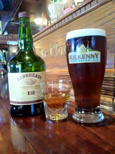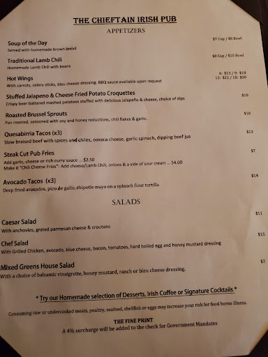 Ive been here quite a few times, each time for a watching a major sports event. Ive tried the other bars around the area (Rumors: pretty good but service is slow, and Teds Sports Bar: DONT GO; very old crowd and the one overwhelmed bartender tries to avoid eye contact at all costs). Service here is great and its somehow large enough that my husband and I have always managed to end up with seats, even for the Superbowl or the NBA Finals. I really like the relaxed "vibe" of Chieftain. They give you a large, pretty varied menu at your table and the waitresses are friendly. The spacing of the tables is also pretty nice - youre not knocking into each other. Its probably my favorite place to watch a game and get a nice draft beer; they have quite a large selection including cocktails and wine for the beer-nonenthusiasts out there (confession: sometimes I get wine or cocktails instead; cocktails are okay but they use smaller ice which sometimes melts too quickly for my liking - I want to sip and enjoy the game...). People are generally around the late 20s and early 30s crowd and typically pretty into the game, but its never rowdy enough that you cant hold a conversation. Just occasional extremely loud cheers. Onto the food: * Turkey burger: Tastes relatively light but delicious. Theres jalapeno salsa and melted cheese. Comes with a small side of thick fries. * Buffalo wings: Not overly buffalo-ed, which I love. Comes with a side of carrots and celery, so that you feel mildly healthy. * Spicy irish potato bites: Hell yes. Balls of spicy mashed potatoes and jalapeno that are fried. Genius.