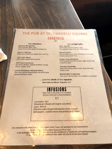 The Pub was a great place to stop for some comfort food in Ghiradelli Square. The portions were huge. My husband and I should have taken the waiters advice and shared 1 appetizer and 1 entree. We tried the jalapeno poppers, chili mac and cheese and brisket. All were delicious, but very filling. Lots of local craft beers on tap. Reasonably priced.