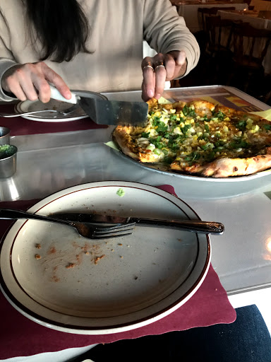 Parking can be a bear, and the pizza has enough grease on it to power a small south african nation. Youll also smell like... er, Im not exactly sure what, but youll SMELL REALLY STRONG after eating even a few bites of their Indian pizza. You know what, though? Its worth it. The pizza is oddly tasty, very filling, and cheap for the amount of food. Im not sure Id make a whole meal out of just this pizza, but as an after-workout replenisher, it probably cant be beat (lots of protein, certainly lots of carbs, and so on). Oh, and last I was there, they had half-carafes of reasonably decent red wine for $4. Nice! Then you wont care how bad you -- and your friends -- smell! :)