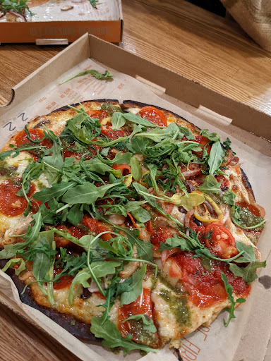 The pizzas themselves are not bad tasting. However, their service has really taken a dive as of late. I placed an online order last night, then came in to get it. They cook the pizza when you arrive, so I waited as they got the stuff together. First, they forgot a dessert- had to ask for it, and then when the first pizza came out one of the staff very rudely ordered me to take it from the counter, even though it was right in front of me and there was another one he was boxing for me. He must have seen the look on the faces of everyone waiting (myself included) as he then stopped and explained that they sometimes have people take the wrong pizza. You can imagine how ironic it was when I got home with my order and discovered that he had put someone elses pizza into one of my boxes. It was unfortunately gross (seems many Blaze customers have eclectic taste in toppings). A simple glance at it would have shown anyone there was an obvious problem, as the pizza in question was to have red sauce, and this one had white. The box had my name written on it and the correct order listed on it... guess someone else must also be wondering where their pizza went. To cap it off, they didnt offer to refund me when I called, they simply said come back and well give you a free one. So I drove back, handed them the box with the correct ingredients listed on it (I wasnt about to eat whatever-that-was inside of it), then had to wait in line as they remade it from scratch and baked it. To be fair, the guy who redid it was apologetic, but I had to make another trip and wait another 20 mins due to their mistake... and they didnt do anything to compensate me for it. Bottom line: if you order from these guys, you should definitely check every pizza before leaving. Or better yet, stand there and watch them take it out and box it. Do not just look at the label, see your name and the order list, and believe they were smart enough to put the right pie in the right box. They arent. And if they mess up, dont expect any kind of accommodation for it- youll just have to come back and get it redone. Personally, Ive decided Mod Pizza across the street is a better deal overall.
