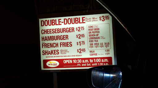 I love going to In-N-Out the people that work there are so polite well mannered and I think the best hamburger in town and a reasonable price milkshakes a great and thick They Dont Really skimp on anything theyre great and you can see your food is made fresh as you order it very hard-working young people and I might add and a good starting rate to start work at In-N-Out Burger which is not hurt their business at all because theyve got the best hamburger in town and the most reasonable prices will be back as always
