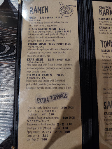 Its a small spot, only 30 occupants. We were looking for a ramen place, we got one! Appetizers were great (black pepper chicken, and yakitori) of our group, two of us got noodle- less ramen, while the other got shouyo ramen. Soup base is amazing, eggs were cooked wonderfully, pork was amazingly tender! Menma (bamboo shoots) were overcooked, most of the other vegetables added a crunch. According to the eater of noodles, they werent cooked very well (but they also have a bias to a ramen shop we used to frequent)