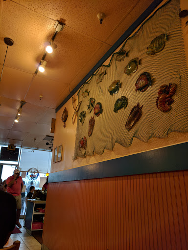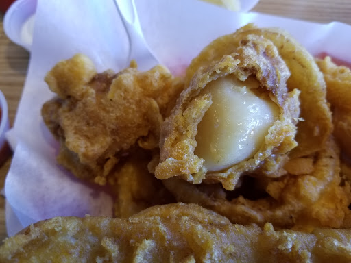 This is a small place with fun fishing related decor.They should get some tables outside, I think the fish and chips are pretty average in price. I got the fish and oysters. The fish strips were pretty big and crunchy, and the crispy golden batter made it look like tempura. The oysters were good too but were a little overcooked for oysters. I have had fried oysters in Japanese restaurants so I know how they could be cooked.They were not plump and juicy inside. I think they should cook them for a little less time.They were very crispy, though. The ambiance was overall pretty nice.