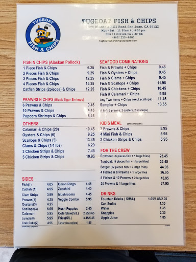 Fish & chips are comfort food for me. As a boy growing up in a Catholic family in Southern California, my parents frequently indulged in Fish & Chips from the local Fish & Chips place near our home. For many years, it was H. Salt Fish & Chips. Then when H. Salt had to shut down to make room for a bigger supermarket, another privately owned place quickly sprung up in its place. They were always pleasant, enjoyable meals for a quick family night out. Slowly, over the years, it was sad to see places like that deteriorate in quality. They often changed ownership and drifted into strange, horrible little hybrid restaurants like "Fish & Chips and Chinese Food" or "Fish and Chips and Donuts". I guess it was a big market, so it just went downhill. When I moved to the Bay Area, I was excited to discover an H. Salt on Blossom Hill near Costco. My wife and I went there full of optimism. The owner was incredibly nice to us and the service was excellent, but the food certainly didnt live up to my memories of H. Salt from my childhood. It was heavy with grease and had a nasty fishy taste to it. We were the only customers in there the whole time we were there. I had somewhat given up hope for finding a decent Fish & Chips place until I came up Tugboat Fish & Chips on Blossom Hill near Cahalan Ave (near Outback Steakhouse). This place is great! The batter is light and the fish is high quality throughout without any nasty spoiled fish flavor. They serve nice, big pieces of fish too. A 1-piece with chips makes a full meal for me. I now frequent Tugboat on weekends whenever I drive by that strip mall near lunchtime. Everytime Ive been in there, theyve always got a healthy-sized crowd seated at the tables and a good take-out business going as well, so you know the fish is getting good throughput without sitting around to spoil. The cook the food right as you order too. It doesnt sit around under any heatlamps. They also serve a variety of other fried seafoods, chicken strips, corn dogs, and hush puppies. The restaurant is tastefully decorated and always clean everytime I go there.