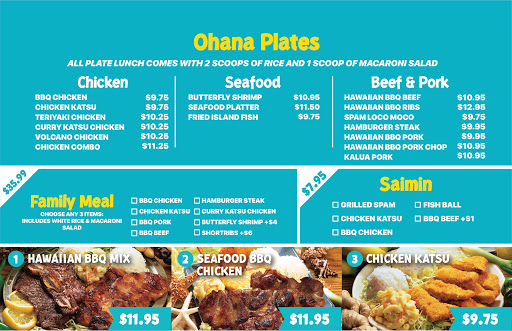 handful tasty bbqd & seafood mixed Hawaiian foods