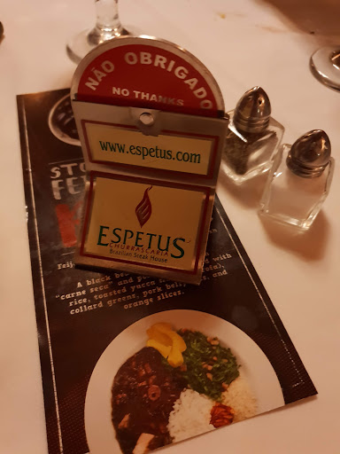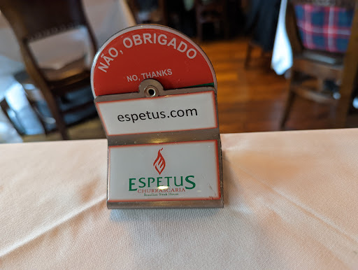 Having eaten at numerous Brazilian steakhouses in a number of states, I found Espetus to be lacking for the price. For $50 I would have expected meat cooked properly, more fresh sides and a salad bar to remember. The "filet mignon" was actually the tenderloin side muscle and was cooked well without an ounce of red or pink in it. All the other beef cuts were 50/50 from medium well to well. The chicken sausages and drumsticks were delicious. The salad bar had some tasty treats but about half of it was pre-mixed stuff. Sides were refreshed upon request and the cheesy bread was delicious while the fried polenta was almost all over-cooked and had the flavor of old frying oil. My friend and I had the Brazilian limeade and while asked a few times if we wanted refills, were never told that the refills were not free. Water refills were prompt and we never felt unattended to. All in all it was a tasty meal but seemed more on par with a $35 Brazilian steakhouse than $50. I would go to Texas Roadhouse or Fogo de Chao in a heartbeat for the money and probably wouldnt go back to Espetus unless it was for a cheaper lunch.