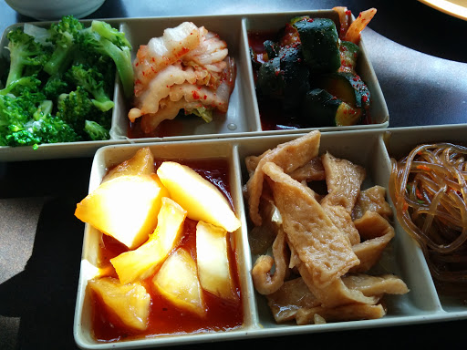 I suppose a vegetarian cant expect much when they enter a restaurant with a dancing chicken logo. Actually, there are a few vegetarian options here, including bibimbap (rice bowls) and soon doo boo (tofu stew). The vegetarian versions of these two dishes are not especially flavorful, so be prepared to add copious amounts of chili or soy sauce. The ubiquitous side dishes are pretty tasty (and many are vegetarian).
