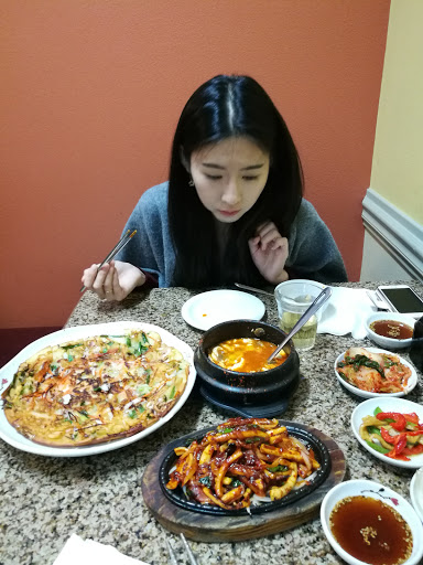Good place to grab lunch or dinner. I like coming here for work lunches so I dont have to pay or fight for parking in downtown San Mateo. This plaza has a big parking lot with pretty easy parking. If youre coming for lunch, try to get here close to opening time, otherwise youll find yourself waiting for a table. Service is pretty quick and attentive. Goon Man Doo (6pcs) - Pan fried dumplings Shared these with a friend as an appetizer. yum! Ojing Uh Dduk Bok Um- Sauteed spicy squid with rice cake. (spicy) ($15.99) This is one of my favorite Korean dish but it was definitely a miss here, especially with that $16 price tag. Some of the rice cakes were not cooked all the way through and still a little tough. Hae Mool Dol Sot Bi Bimbop Seafood, vegetables, fried egg over rice served in hot stone pot (spicy) $15.99. They are very generous with the seafood and give you a huge portion. I love bibimbop so Ill order the seafood one or the beef. I havent ordered the tofu soup for myself but stole some of the pork dumpling soon doo boo from my friend.