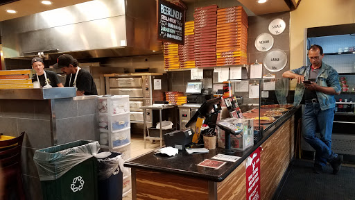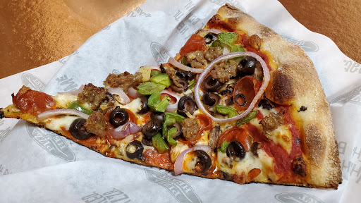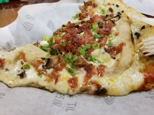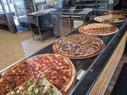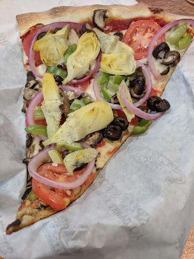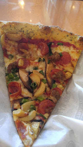 Love to swing in here for a quick lunch slice or two. Pizza is always very tasty with fresh-tasting toppings. Its very thin crust and not always cooked as long as I like, but thats a minor complaint. Tea, fancy soda-selection machine with lots of options and a fast and friendly staff. Clean place, too! Bathrooms could use some help but thats a minor ding.