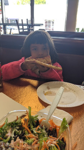 Delicious New York thin crust, but mainly we loved their vibes for kids on Tuesdays from 5-8 pm. We had stumbled into this place because it was close to Central Park where we were letting my 6-year-old niece run around during a family stopover at San Francisco Airport (SFO). Pizza My Heart had a special where kids could put together their own mini-pizza on Tuesday evenings, and this night they had a juggler for the kids too. My niece got the T-shirt with the pizza, and now she says shes an employee of Pizza My Heart when she wears the shirt! We were tired out, but the staff was still amazingly friendly and accommodating. Yes, the prices were high -- $28 for a medium pizza, kid pizza (with T-shirt), and chicken Caesar salad -- but the food is great quality, and we felt lucky to find this place.